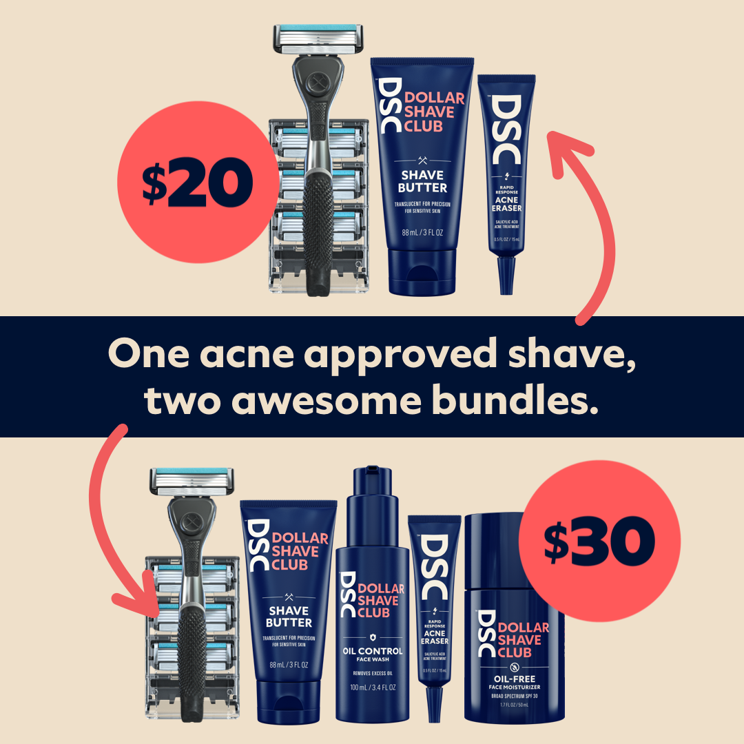> "Square 1:1 ad visual at 2K resolution. Horizontal split layout with a neutral cream background. Top section features a 3-product shaving kit (razor, shave butter, acne spot treatment) with a bright coral circle displaying '$20'. Bottom section features a 5-product expanded kit (adding face wash and moisturizer) with a coral circle displaying '$30'. A dark navy horizontal bar in the center separates the two sections. Typography: Bold, rounded sans-serif in white. Text displayed in the center bar: 'One acne approved shave, two awesome bundles.'. Use hand-drawn style coral arrows pointing from the text to the products. Studio lighting, clean product photography style."