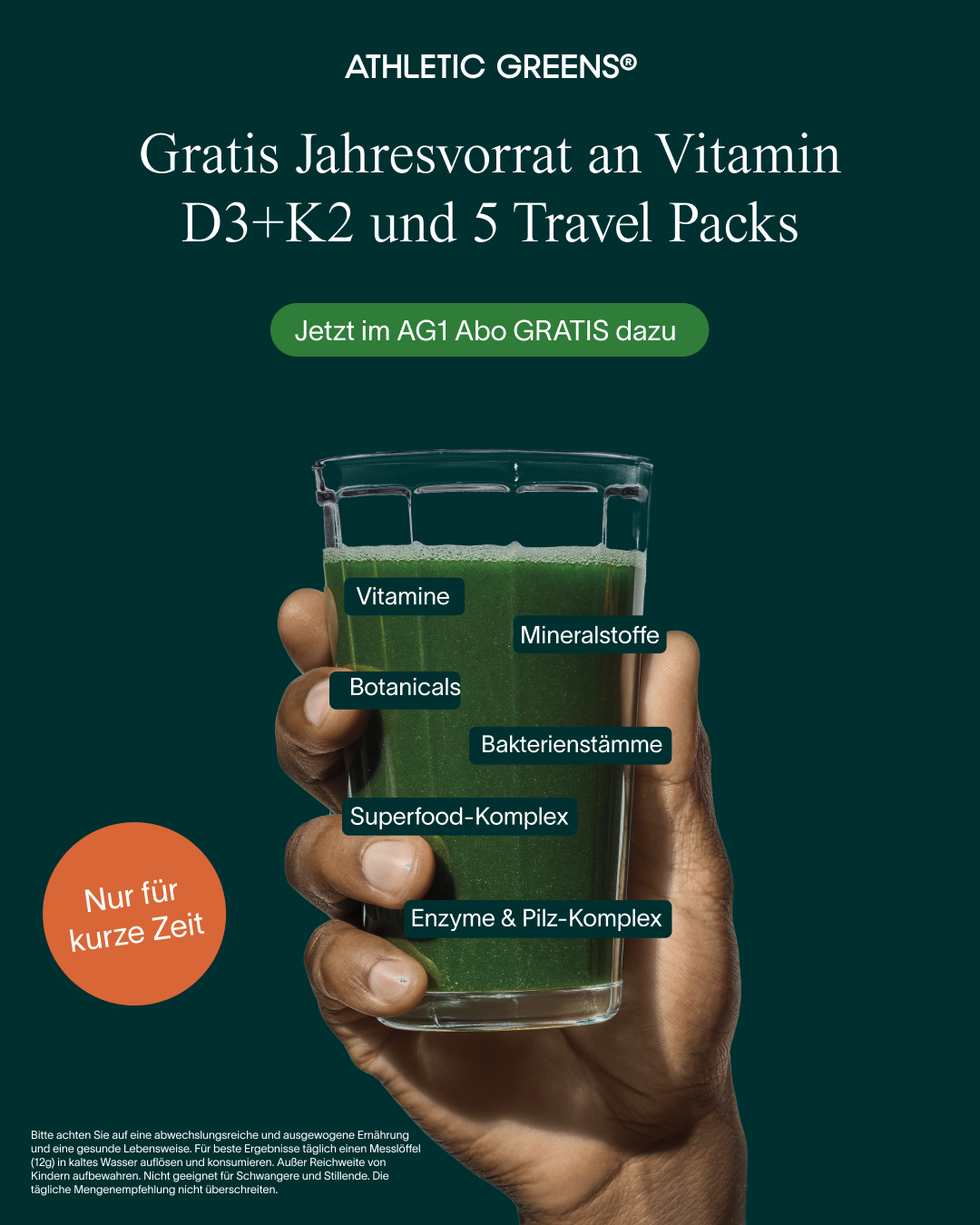 Lerne AG1 kennen: Fundamentale Ernährung einfacher gemacht mit 75 Vitaminen, Mineralstoffen und weiteren Zutaten aus echten Nahrungsmitteln.<br /> <br /> Für einen begrenzten Zeitraum erhältst du jetzt GRATIS einen Jahresvorrat an Vitamin D und 5 praktische Travel Packs zum Abo dazu.