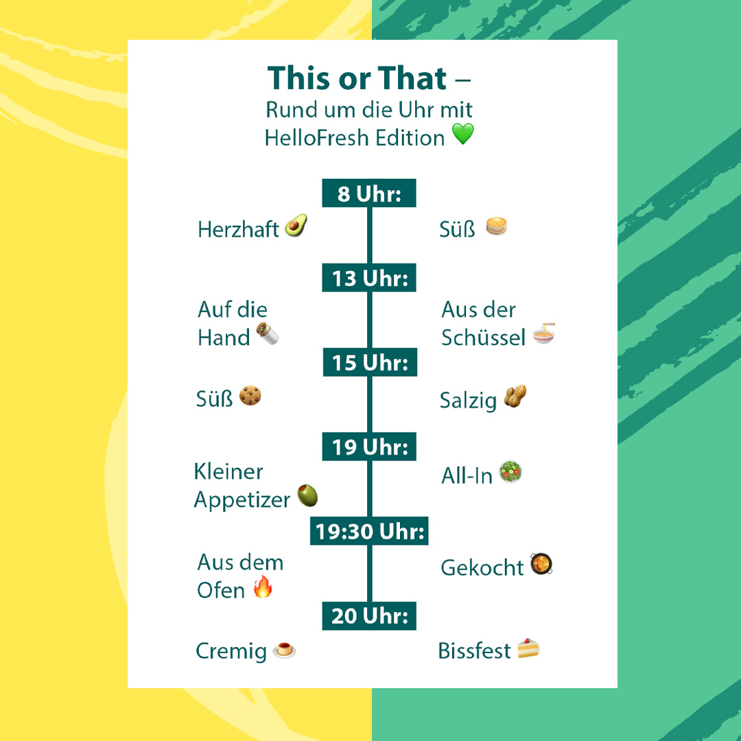 - "Rund um die Uhr mit HelloFresh Edition 💚" | [Promesse de marque] | Technique : Inclusion du quotidien | Réaction : Sentiment de présence constante | Hypothèse : HelloFresh peut couvrir tous mes repas.
