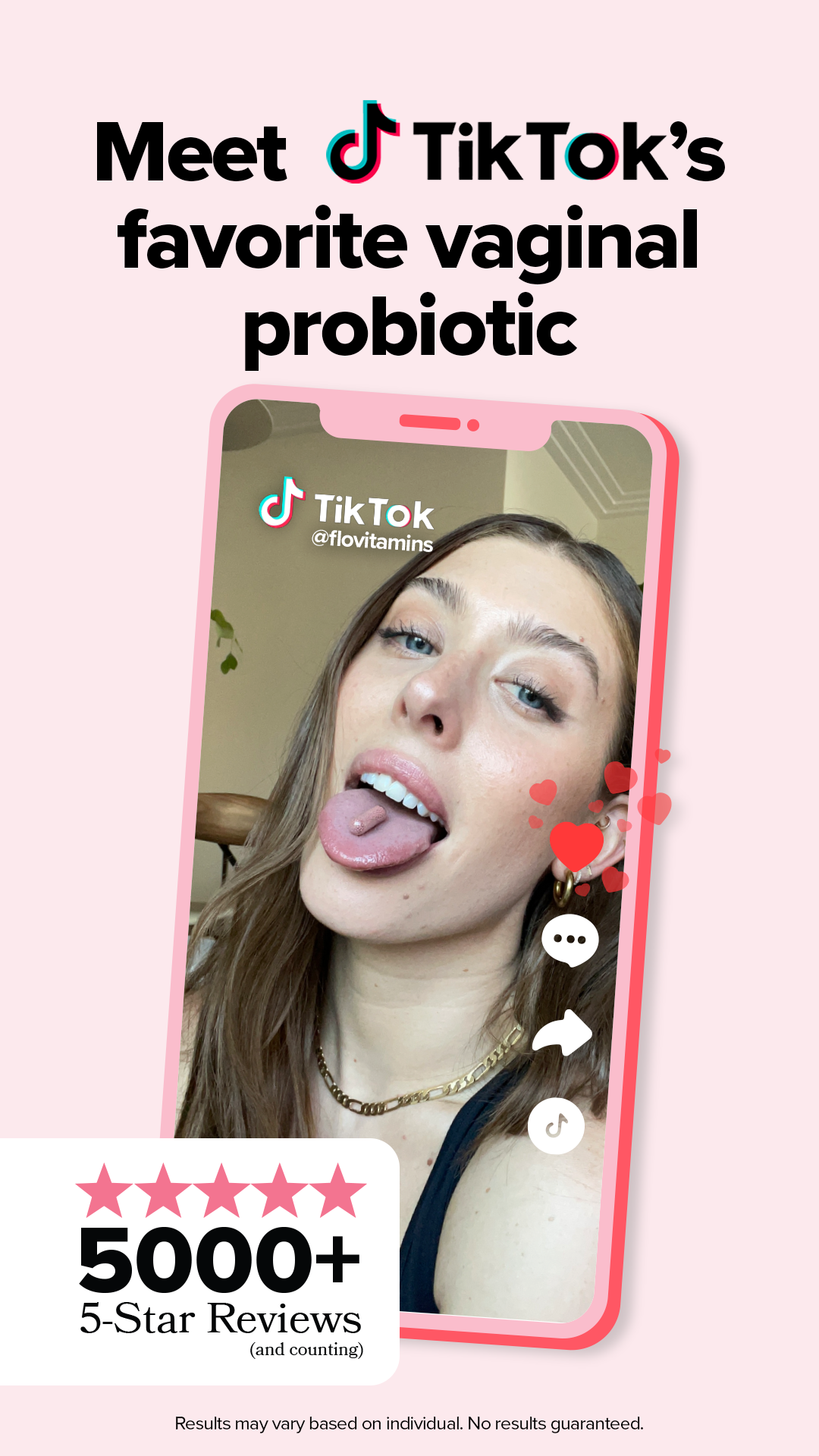 "Vertical 9:16 ad visual (or Square 1:1 version) at 2K resolution. Layout: A large, high-quality photo of a woman showing a probiotic capsule on her tongue, framed inside a pink smartphone mockup with TikTok-style interface elements (like/comment/share icons). Typography: Bold, black sans-serif font for the headline. Palette: Soft pink background with vibrant red and cyan accents. Text displayed: 'Meet TikTok's favorite vaginal probiotic' at the top, and a white floating card at the bottom left with '5000+ 5-Star Reviews' and five pink stars. Style: High-end UGC (User Generated Content) aesthetic. Clean, bright lighting, relatable model with gold jewelry."