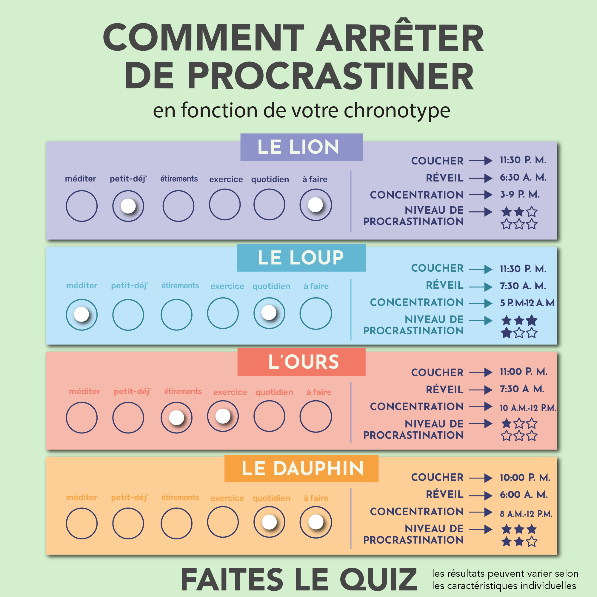 "Square 1:1 ad visual at 2K resolution. Infographic style layout divided into four horizontal colored bands (Pastel Purple, Teal, Soft Red, Orange). Top of the image features a large bold title in French: 'COMMENT ARRÊTER DE PROCRASTINER'. Each horizontal band represents a 'Chronotype' with an animal name: 'LE LION', 'LE LOUP', 'L'OURS', 'LE DAUPHIN'. On the left of each band, show small circular habit icons (meditate, breakfast, exercise). On the right, display text-based data for 'Coucher', 'Réveil', 'Concentration', and a 5-star 'Niveau de Procrastination' scale. Clean, modern sans-serif typography. Bottom footer in dark grey with text 'FAITES LE QUIZ' in large bold letters. Minimalist icon-based design, no real-life photos."