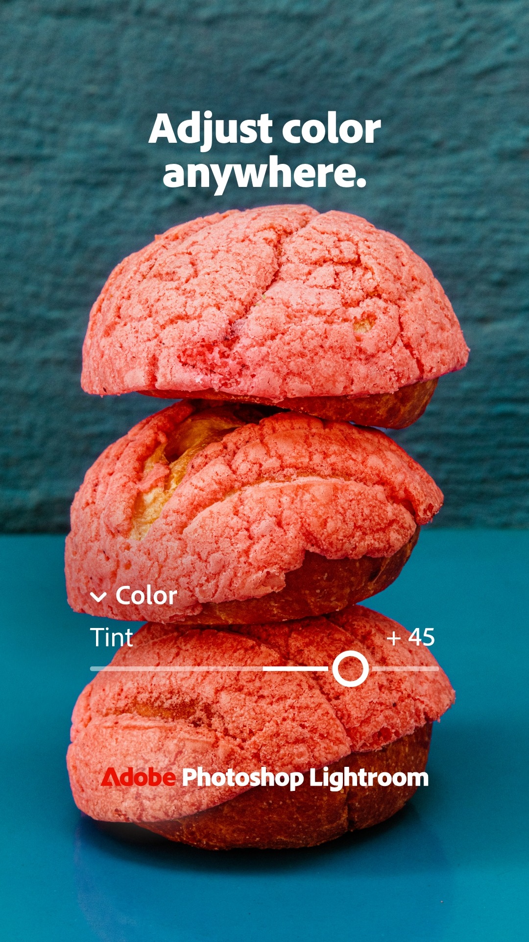 > Layout: Top-aligned bold white text. An app UI slider element (Tint slider) is overlaid on the bottom half of the bread stack, showing a white circle selector at '+45' position.