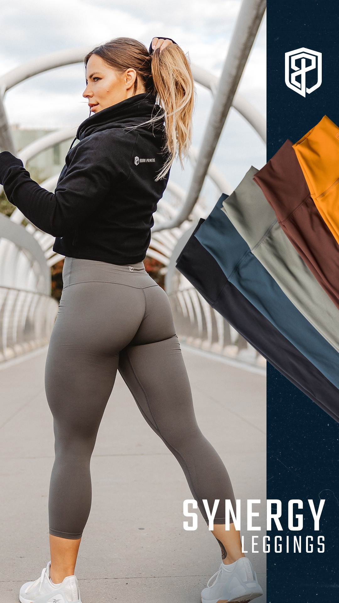 "Portrait 9:16 ad visual. Vertical split layout. Left side (2/3): High-quality lifestyle photo of an athletic woman from behind/side profile on a modern bridge, highlighting her leggings and physique. She is wearing a black hoodie and grey leggings. Right side (1/3): Dark navy textured sidebar featuring a fanned-out stack of legging fabric swatches in olive green, slate blue, charcoal, rust, and mustard yellow. Top right features a white shield-style brand logo. Bottom right text: 'SYNERGY LEGGINGS' in bold, white, condensed sans-serif uppercase typography. Style: Professional fitness photography, high contrast, moody but clean."