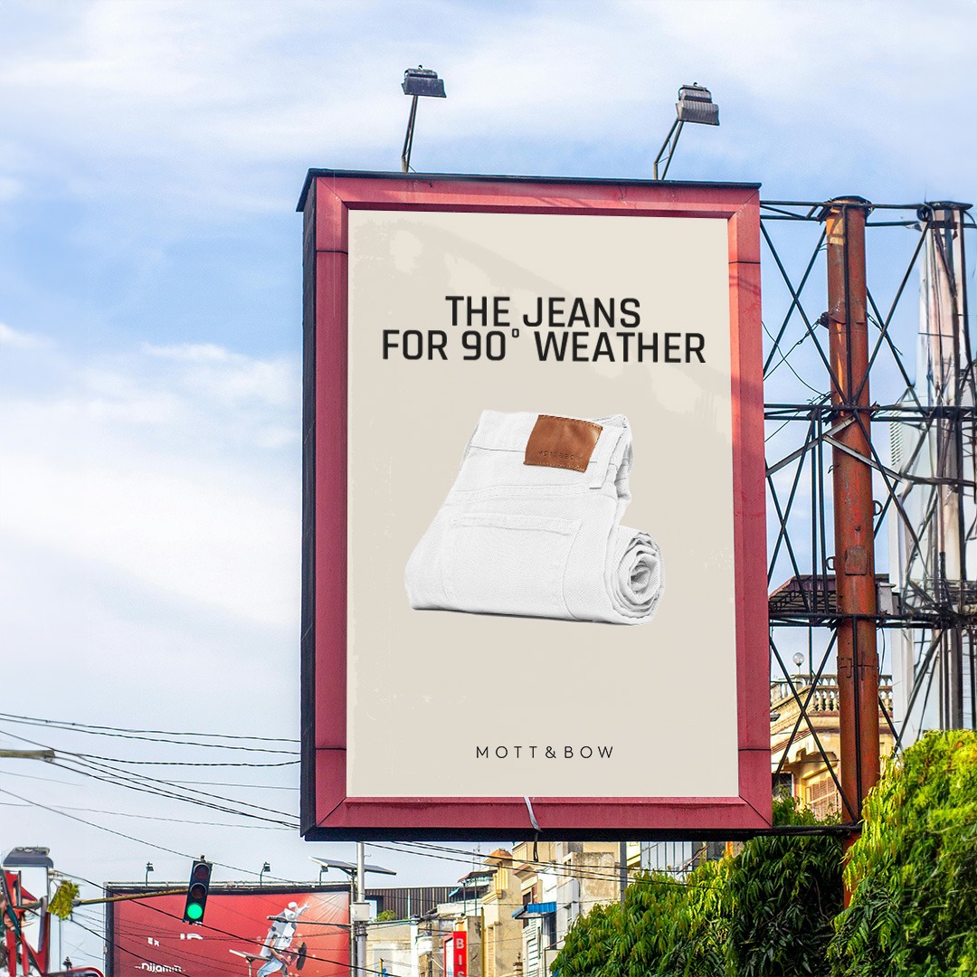 "Square 1:1 ad visual at 2K resolution. Layout: A realistic outdoor billboard mockup set in a bright urban environment with blue sky and city elements. The billboard has a bold red frame. Product: A pair of white/off-white denim jeans, neatly folded, showing the back pocket and a brown leather logo patch. Typography: Clean, modern Sans-Serif font in all caps. Palette: Neutral beige background inside the billboard, white product, urban colors in the background. Text displayed: 'THE JEANS FOR 90° WEATHER' at the top, and 'MOTT & BOW' at the bottom. Style: High-quality commercial photography with a minimalist aesthetic."