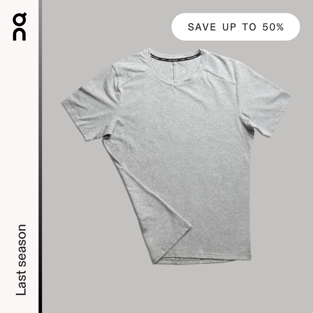"Square 1:1 ad visual at 2K resolution. High-end flat-lay photography of a grey performance t-shirt on a solid grey background. The t-shirt should be centered, slightly folded at the bottom to show fabric quality. Layout includes a distinct white vertical sidebar on the far left containing a minimalist logo at the top and the text 'Last season' written vertically in black sans-serif. At the top right, place a white pill-shaped badge with the text 'SAVE UP TO 50%' in black, wide-spaced sans-serif typography. Aesthetic: Swiss minimalism, premium, clean, tonal grey palette."