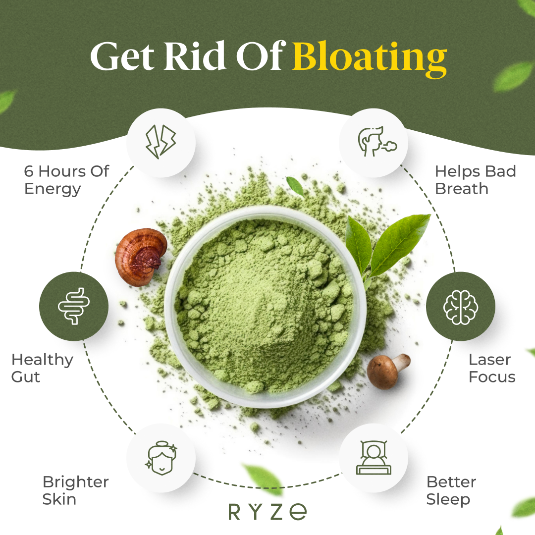 "Square 1:1 ad visual at 2K resolution. Radial layout with a white circular container in the center on a dark forest green background with scattered tea leaves. In the very center, a top-down view of a clear glass bowl filled with vibrant green matcha powder. Surround the bowl with 6 minimalist line-art icons connected by a dashed circular line. Include a real Reishi mushroom and a button mushroom tucked near the central bowl. Typography: Elegant Serif for the main headline and clean Sans-Serif for the benefits. Palette: Forest green, matcha green, white, and a pop of yellow for the key problem word. Text displayed: 'Get Rid Of Bloating' at the top, and 'RYZE' logo at the bottom. The 6 benefit labels: '6 Hours Of Energy', 'Helps Bad Breath', 'Laser Focus', 'Better Sleep', 'Brighter Skin', 'Healthy Gut'."