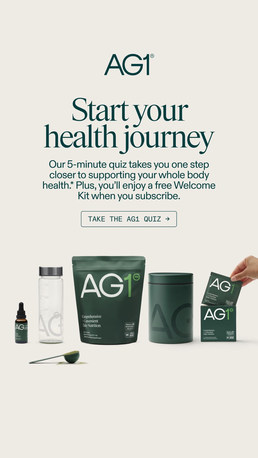- Ce qui attire l'œil en PREMIER : La typographie "Serif" élégante du titre "Start your health journey" et le contraste du vert profond "AG1" sur le fond crème minimaliste.