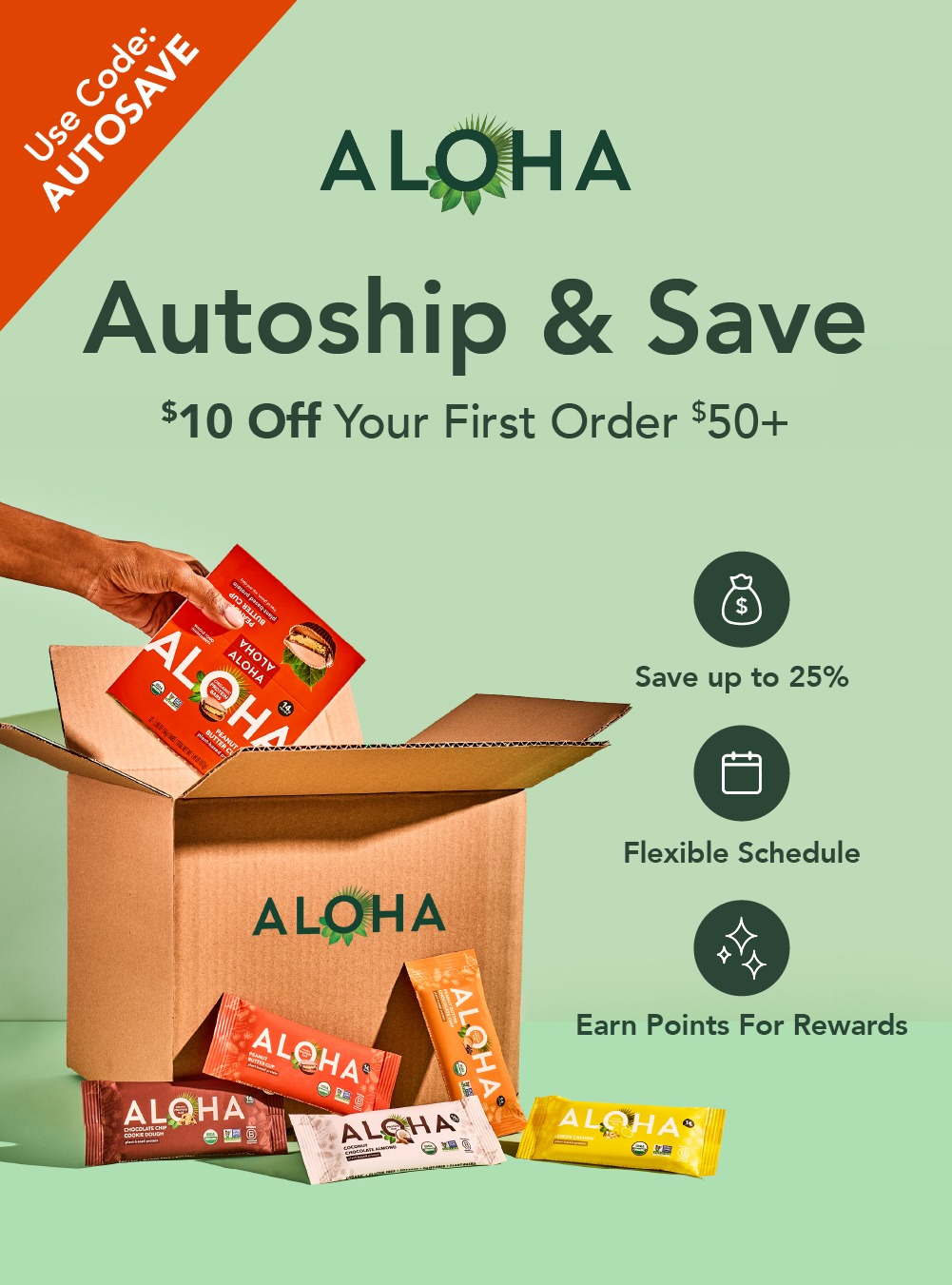"Square 1:1 ad visual at 2K resolution. A clean, mint green background. On the left center, a realistic cardboard shipping box with the brand logo 'ALOHA' on it. A human hand is placing a multi-pack of protein bars into the box. Several individual protein bars in vibrant packaging (red, yellow, orange) are scattered at the bottom. In the top left corner, a bright orange diagonal banner with white text 'Use Code: AUTOSAVE'. At the top center, bold dark green sans-serif text 'Autoship & Save' followed by a sub-headline '$10 Off Your First Order $50+'. On the right side, three vertical circular icons with minimalist white line art representing a money bag, a calendar, and sparkles, each with adjacent descriptive text: 'Save up to 25%', 'Flexible Schedule', 'Earn Points For Rewards'. Style: Bright, professional product photography, high-end DTC aesthetic."