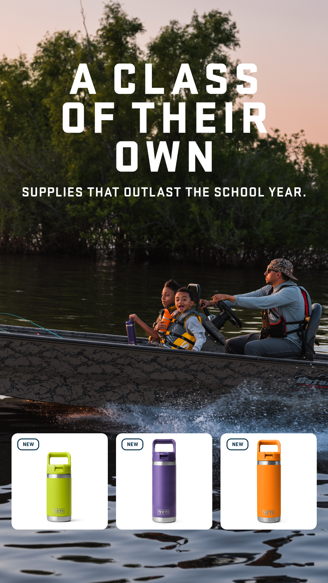 Layout: Top section features large, bold, white sans-serif text. Middle section is a high-quality lifestyle photo of a father and two kids on a camouflage fishing boat during sunset. Bottom section features three distinct white square cards, each displaying a colorful water bottle (Lime Green, Purple, Orange) with a small 'NEW' badge in the corner.
