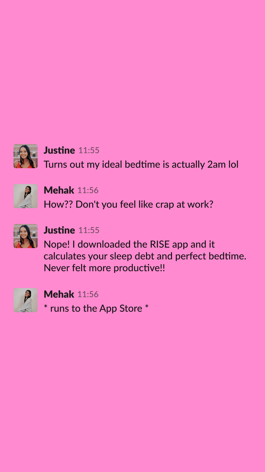 > "Square 1:1 ad visual at 2K resolution. Solid vibrant neon pink background. Minimalist layout featuring a simulated smartphone text conversation (WhatsApp/iMessage style) between two female profiles with realistic avatars. Typography: Clean, modern sans-serif. Text displayed: Justine: 'Turns out my ideal bedtime is actually 2am lol', Mehak: 'How?? Don't you feel like crap at work?', Justine: 'Nope! I downloaded the RISE app and it calculates your sleep debt and perfect bedtime. Never felt more productive!!', Mehak: ' runs to the App Store '. No logos, no extra graphics, just the chat thread centered on the pink canvas."
