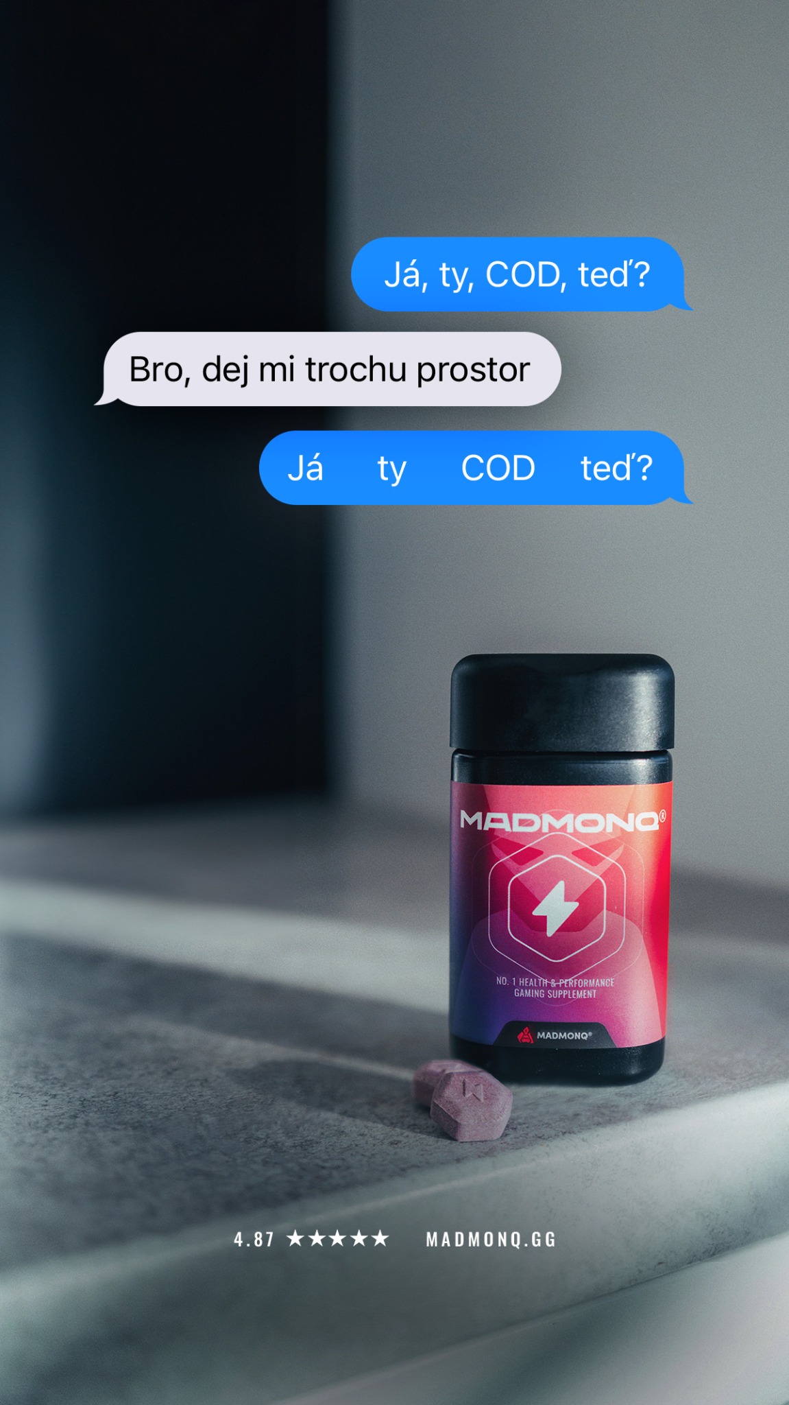"Portrait 9:16 ad visual. Top section features a smartphone chat interface with three bubbles. Text in bubbles: 1. 'Já, ty, COD, teď?' (Blue), 2. 'Bro, dej mi trochu prostor' (White), 3. 'Já [wide spaces] ty [wide spaces] COD [wide spaces] teď?' (Blue). Bottom right features a sleek black and red supplement bottle labeled 'MADMONQ' on a grey concrete-like surface. Two purple hexagonal pills are placed next to the bottle. Cinematic lighting with soft shadows. Bottom center displays '4.87 ★★★★★' and 'MADMONQ.GG' in white minimalist font."