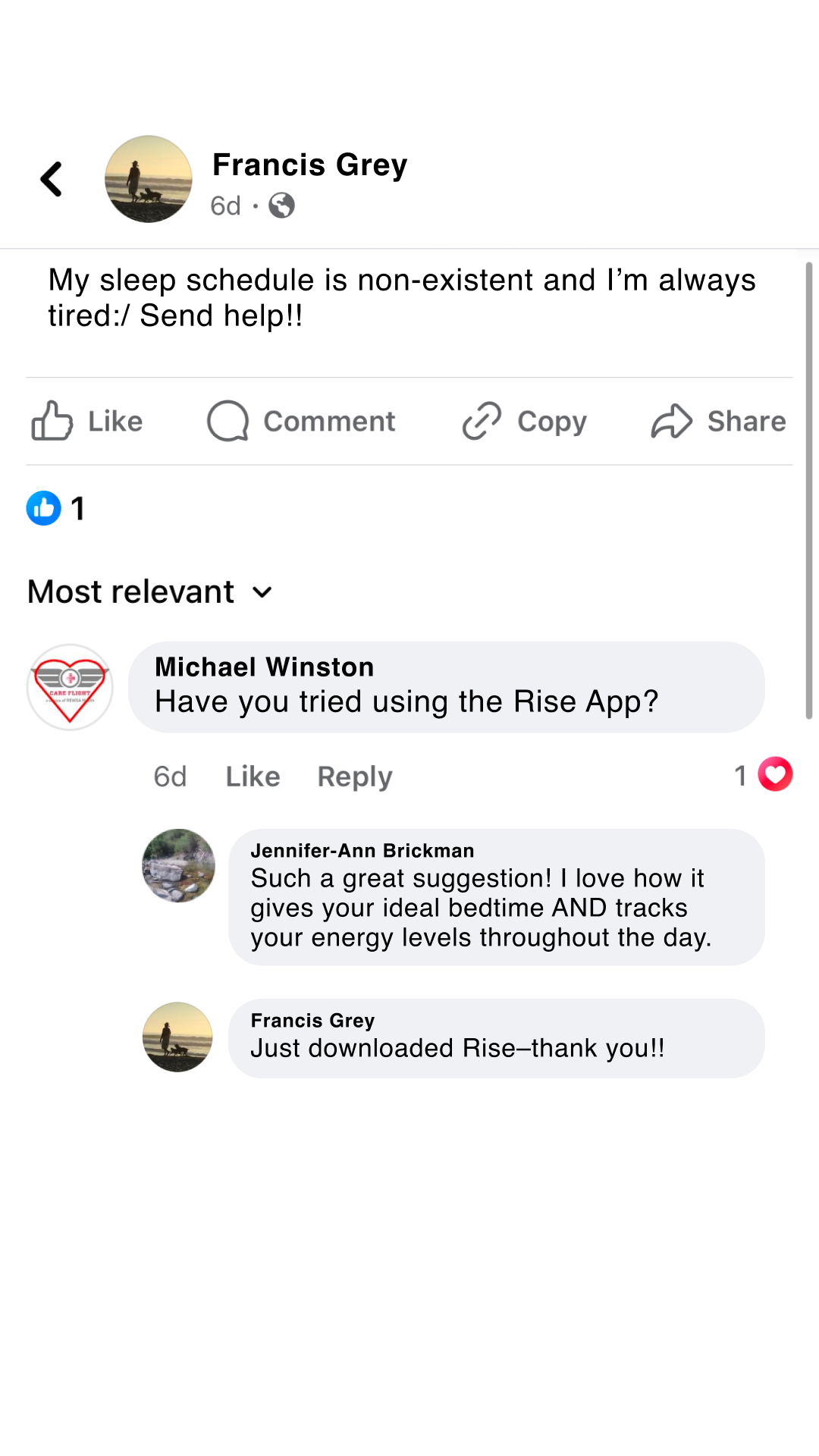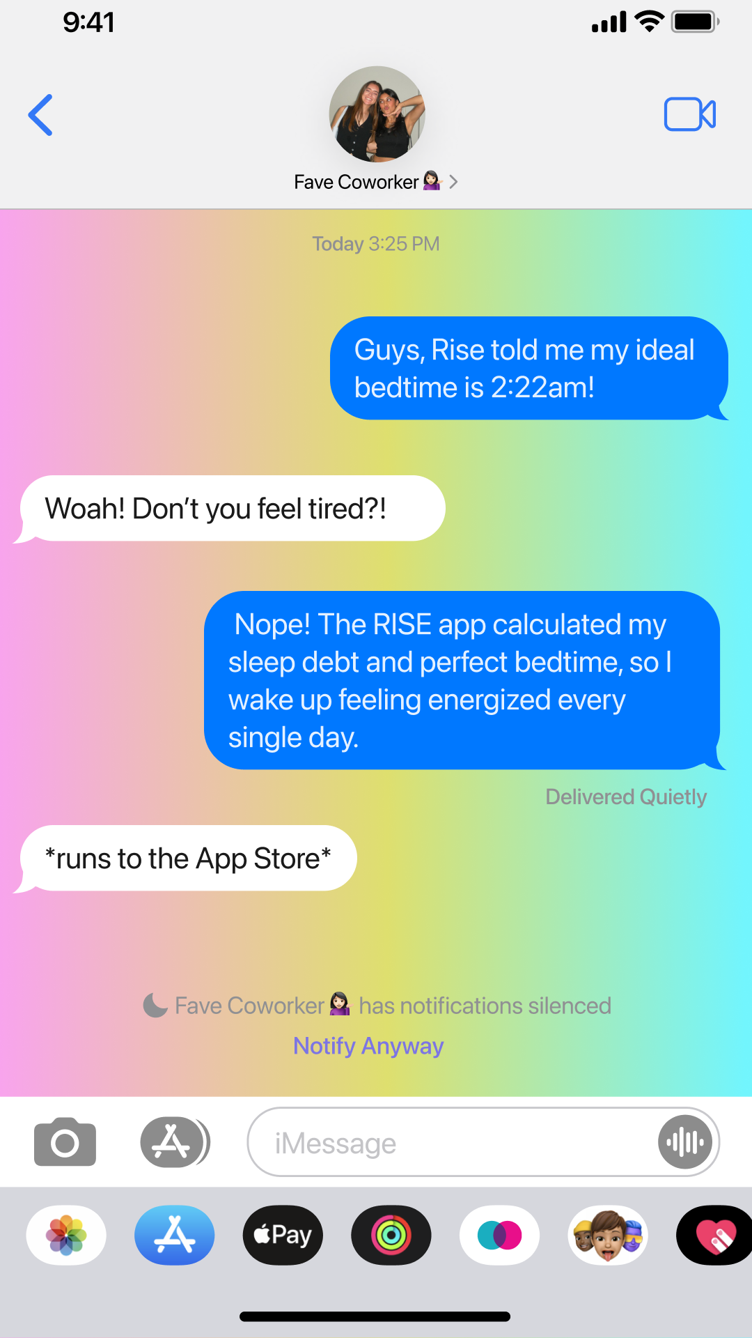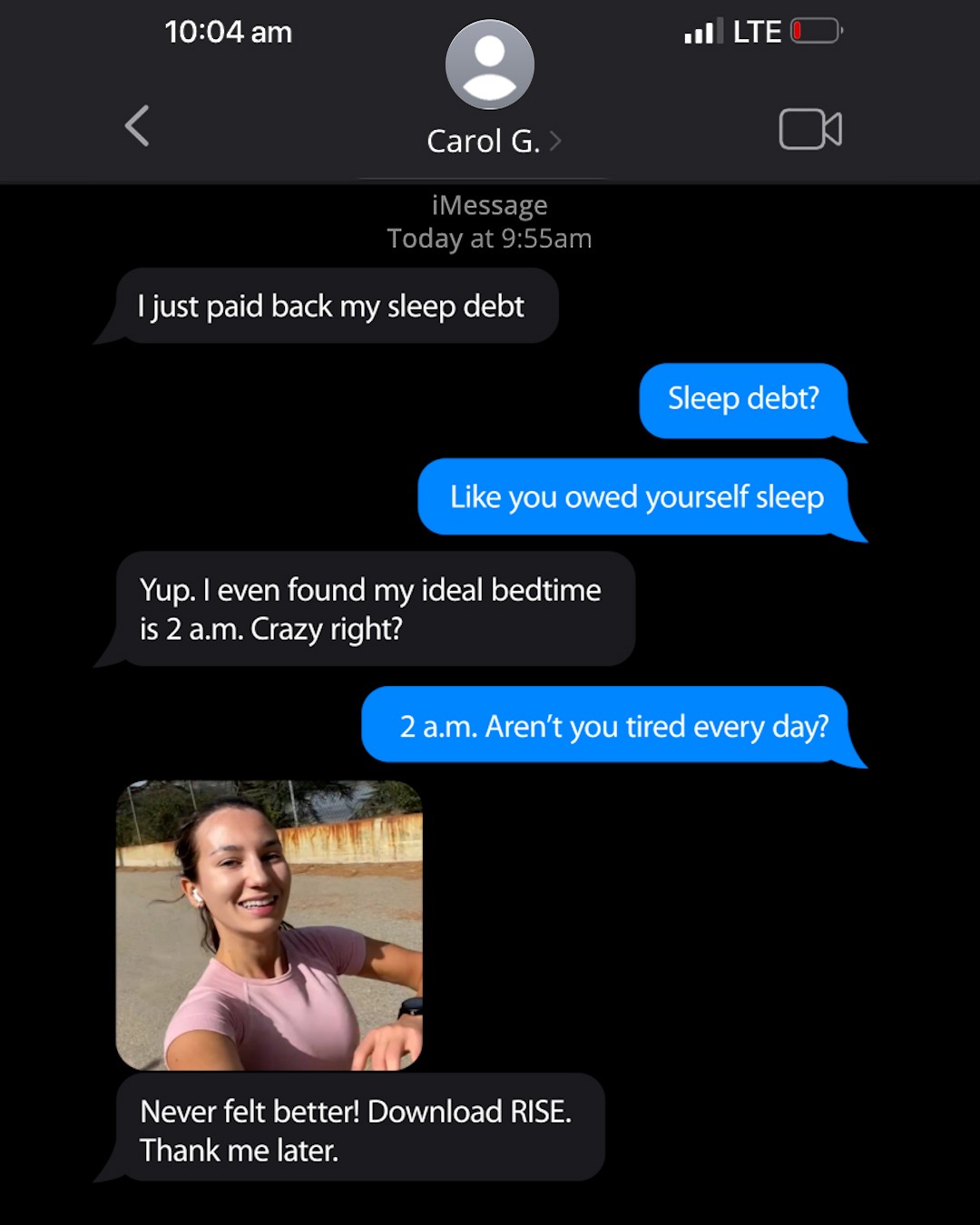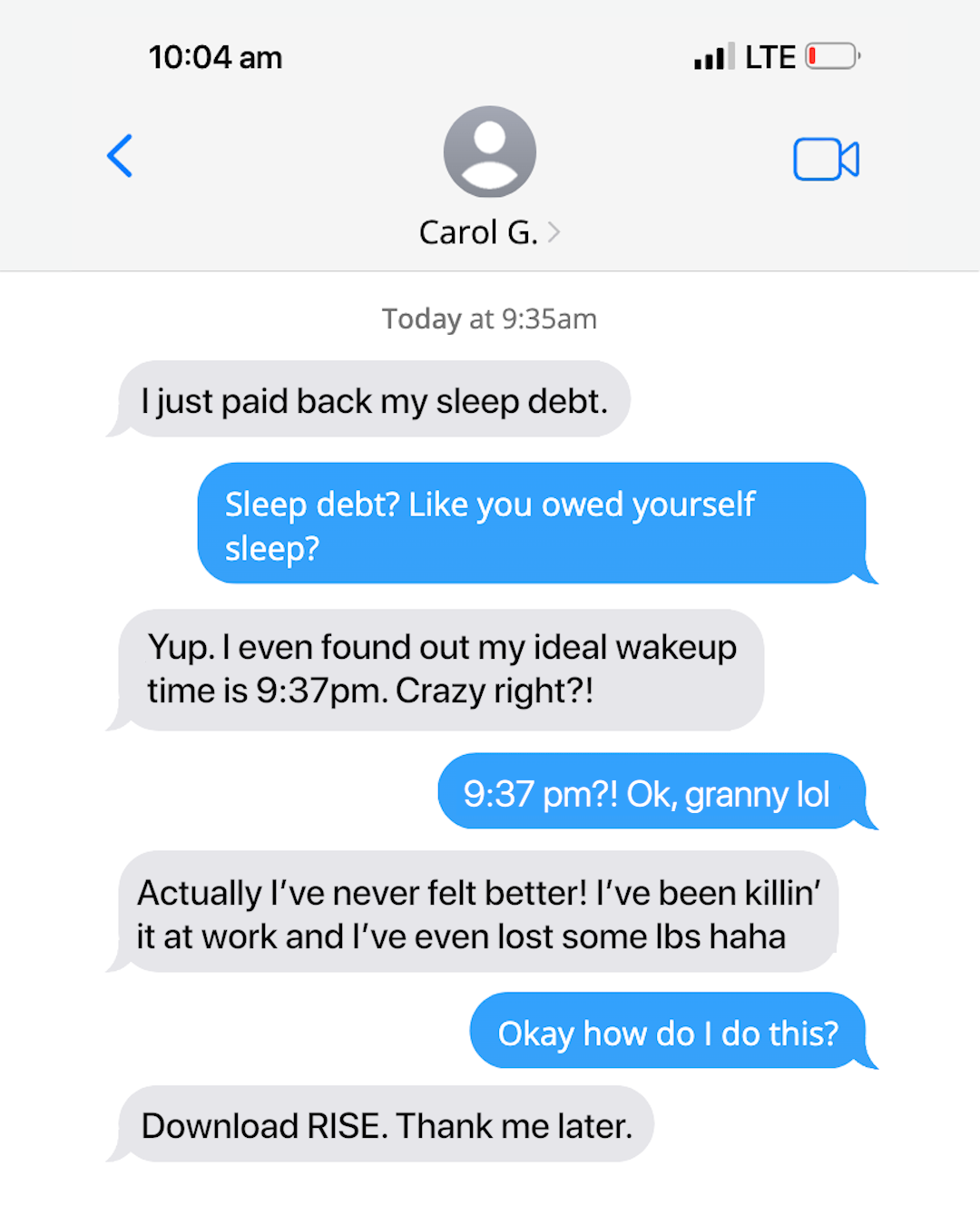 > - Blue (User): "Nope! The RISE app calculated my sleep debt and perfect bedtime, so I wake up feeling energized every single day."