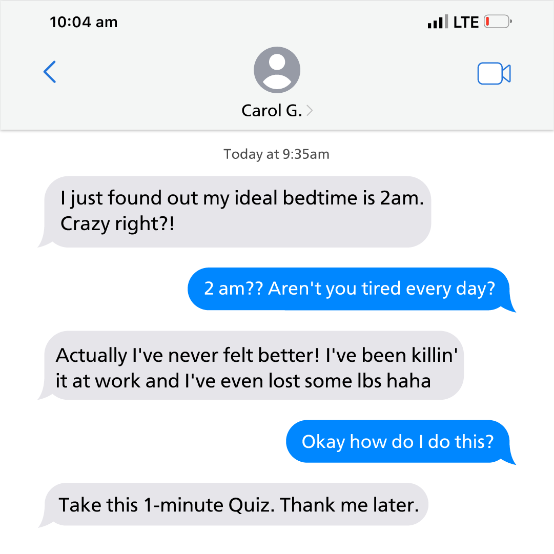 "Square 1:1 ad visual at 2K resolution. A high-fidelity mockup of an iPhone iMessage conversation. The background is the standard iOS white/light gray. At the top, include status bar icons (Time: 10:04 am, LTE, low battery). Contact name is 'Carol G.' with a generic profile icon. The chat features 5 bubbles (3 gray on the left, 2 blue on the right). Text displayed: 'I just found out my ideal bedtime is 2am. Crazy right?!' (Gray), '2 am?? Aren't you tired every day?' (Blue), 'Actually I've never felt better! I've been killin' it at work and I've even lost some lbs haha' (Gray), 'Okay how do I do this?' (Blue), 'Take this 1-minute Quiz. Thank me later.' (Gray). Style: Clean, native-looking screenshot, no logos or extra graphics."