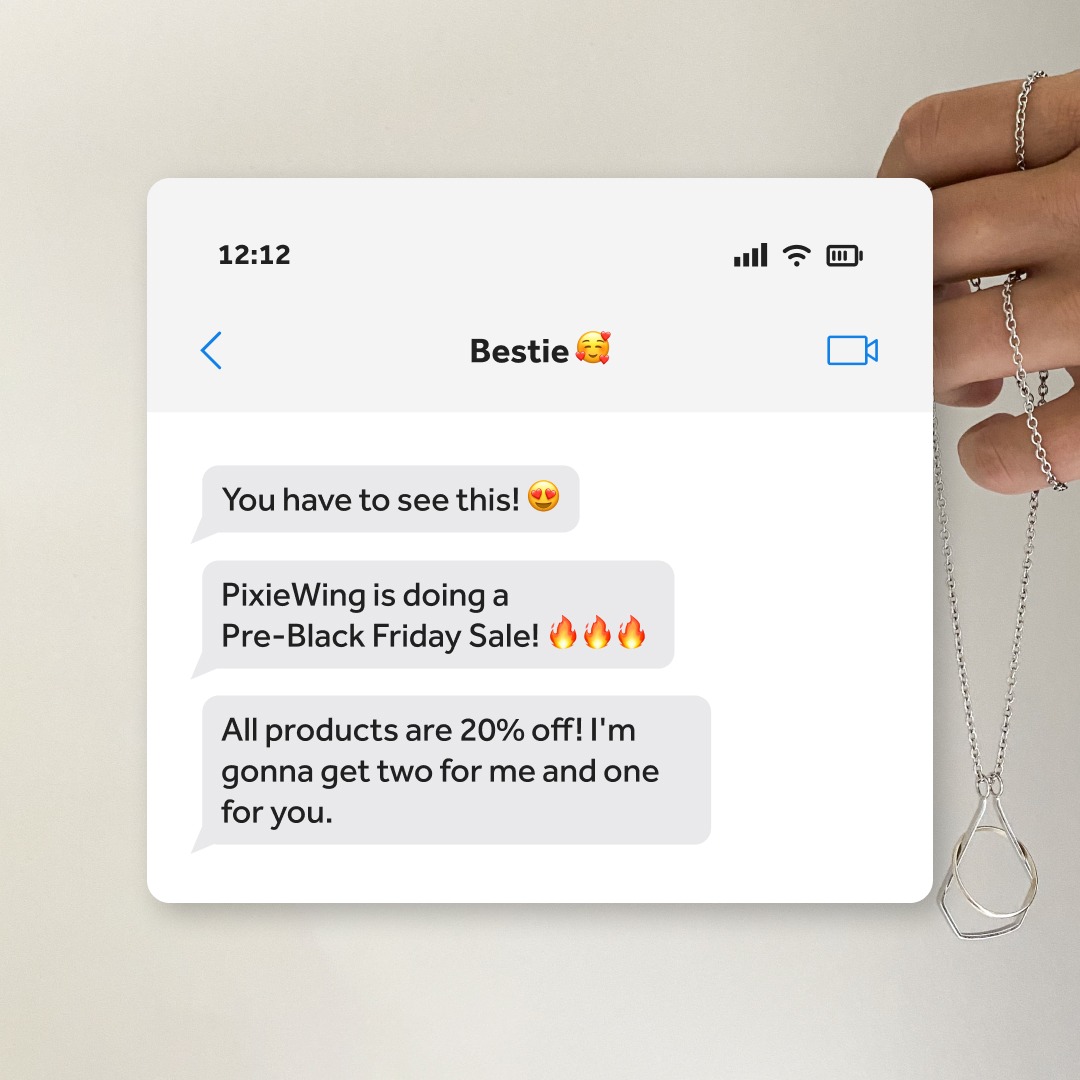 🥰, 😍, 🔥) renforce le côté décontracté et amical ("Bestie")."Square 1:1 ad visual at 2K resolution. The layout features a realistic iOS iMessage conversation window centered-left on a clean, off-white background. On the right side, a close-up of a hand holds a silver 'ring keeper' necklace, showing the functional loop. Typography: Use San Francisco (Apple system font) for the chat bubbles. Palette: Neutral whites, light greys, and metallic silver, with vibrant red fire emojis. Text displayed in bubbles: 'You have to see this! 😍', 'PixieWing is doing a Pre-Black Friday Sale! 🔥🔥🔥', 'All products are 20% off! I\'m gonna get two for me and one for you.'. Style: Minimalist product photography combined with a clean UI mockup."