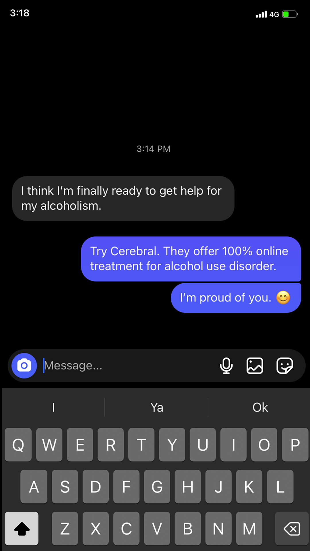 > "Square 1:1 or Vertical 4:5 ad visual at 2K resolution. Layout: A realistic smartphone screenshot of an iMessage/SMS conversation in Dark Mode. UI Elements: Top status bar (time, 4G, battery), bottom iOS keyboard visible with predictive text ('I', 'Ya', 'Ok'). Color Palette: Deep black background, standard iOS blue for outgoing bubbles, light grey for incoming. Text displayed: Grey bubble: 'I think I’m finally ready to get help for my alcoholism.' Blue bubbles: 'Try Cerebral. They offer 100% online treatment for alcohol use disorder.' followed by 'I’m proud of you. 😊'. Style: High-fidelity mobile UI mockup, no photography, strictly text-based conversation interface."